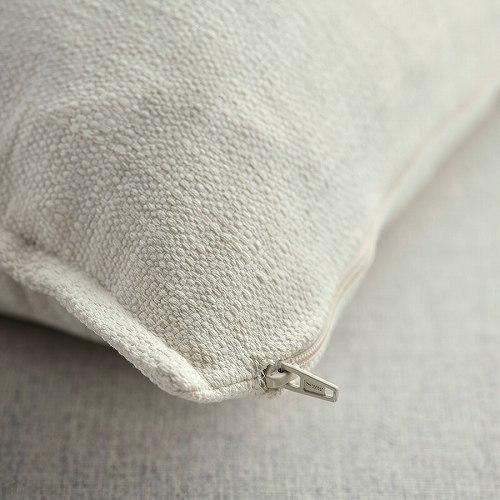 オフホワイトのLAGERPOPPEL ラーゲルポッペル クッションカバーは、表面に抑えめの光沢とテクスチャーがあり、縁周りのフランジがクッションにスタイリッシュな見た目と安定感をプラスしています。