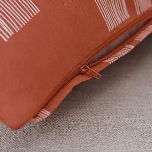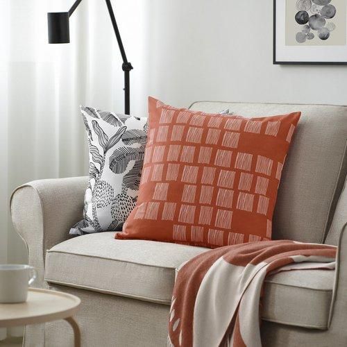 細いラインが並ぶ小さな正方形の模様がいくつも描かれたオレンジ色のクッションカバー。あたたかなエネルギーが家の中に広がります。 イケアのほかの模様入りや無地のクッションとコーディネートを楽しむのにぴったりです