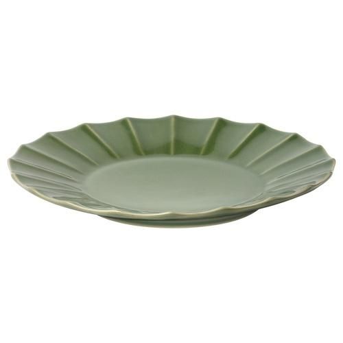 グリーンの釉(うわぐすり)で仕上げた手づくりのせっ器製プレート。縁の立ち上がりにエンボスを施した幾何学的シルエットが目を引き、料理に彩りを添えます