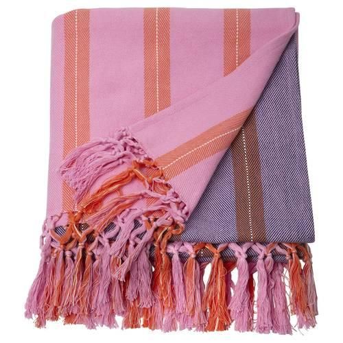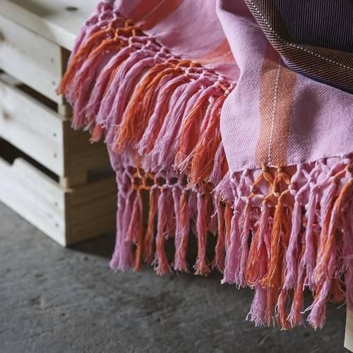 柔らかくてカラフルなブランケット。短辺側の手で結んだタッセルが遊び心を感じさせます。 体に掛けたり昼寝をしたりするときに、心地よく包んでくれます
