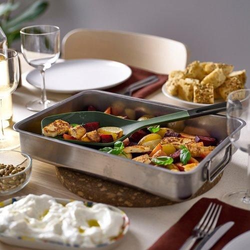 わずかに柔軟性のある先端部分が、調理中の食材の下にスムーズに滑り込むため、フライパンやオーブン皿の中の料理をすべて残らずきれいに取り出して盛り付けられます