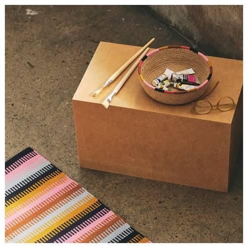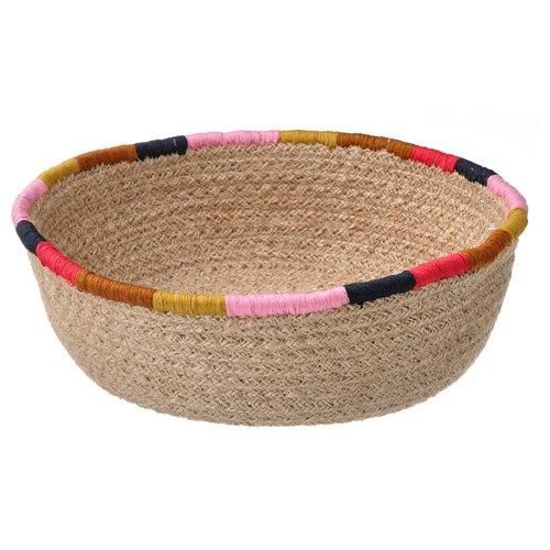 天然素材のジュートで編んだ中型のバスケット。おしゃれで、しかも実用的。明るい色の手刺繍の縁取りが施されています。 手近に置いておきたいよく使う小物類を入れるのに最適です