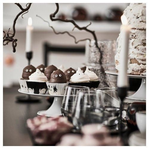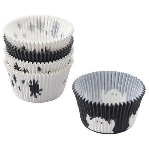 不気味なおばけとクモの模様が入った白黒のベーキングカップ65枚入り。ハロウィンパーティーのカップケーキやマフィン、デザート、ホットスナック、おつまみに最適です