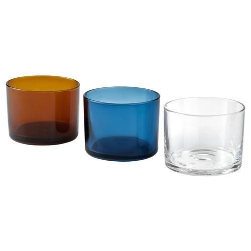 ブラウン、ブルー、クリアのガラス製キャンドルホルダー。 店舗でお気に入りの色をお選びください。複数の色を組み合わせれば、目を引くおもしろい効果が生まれます