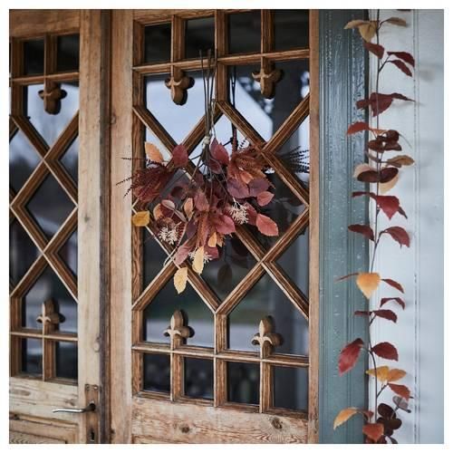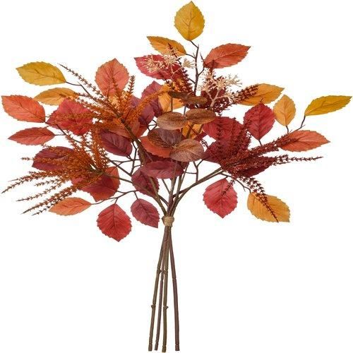 秋らしい明るい色でまとめた造花のブーケ。 明るいトーンや暗いトーンが混ざったこれらの花や葉は、主にリサイクルプラスチックでつくられています。家の中を温かさで満たし、しかもメンテナンス不要です