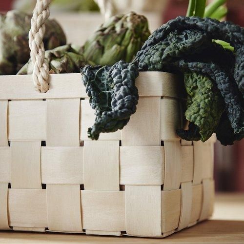 この手編みのバスケットは、野菜やフルーツ、ベリー、キノコを採るときに昔使われていたバスケットにとても似た雰囲気です。 収納として使ったり、ギフトとして贈ったりしてもステキ。 何かおいしいものを入れて贈るのはいかが?