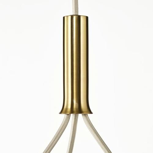 シンプルでエレガント。 真ちゅうメッキの金属製フレーム、吹きガラスのシェード3個、ベージュの布巻きコードを使用したペンダントランプが、ダイニングテーブルやリビングルームを明るく照らします