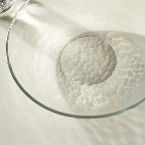 槌目(つちめ)模様のガラスは砂浜の波紋を思わせ、光が差し込むと美しい影の模様をつくり出します。 さらにボウルの柔らかな温かみのあるフォルムが加わり、食卓にちょっとした特別な雰囲気をプラスします!
