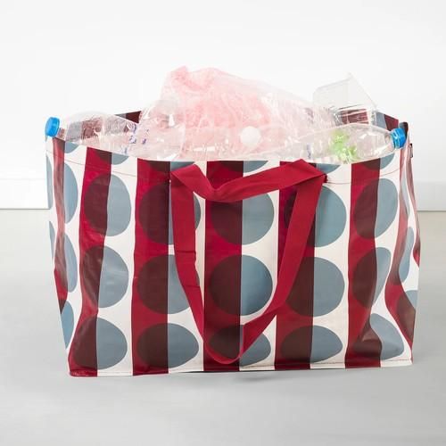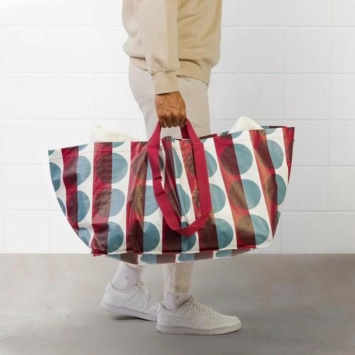 大胆なレッド、ブルー、ホワイトの模様がおしゃれな、大きいキャリーバッグ。 短い持ち手と長い持ち手が両方付いているので、手持ちも肩掛けもできます。 便利で、耐久性があり、リユースできるうえ、GORSNYGG(スウェーデン語で「美しい」の意味)という名前のとおり、とても見栄えするバッグです