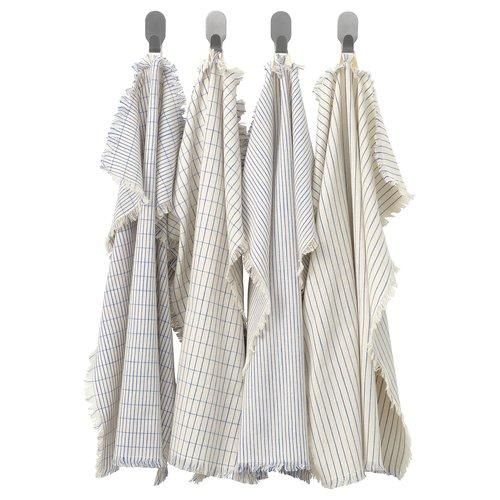 装飾的なフリンジ付きのチェックとストライプの美しいキッチンクロスは、流行に左右されない見た目です