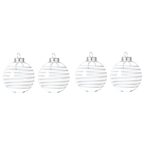 VINTERFINT ヴィンテルフィント コレクションでは、いろいろなタイプのクリスマスツリーオーナメントを取りそろえています。 このホワイトのストライプ柄のガラス製オーナメント4個セットは、エレガントな雰囲気をツリーにプラスします