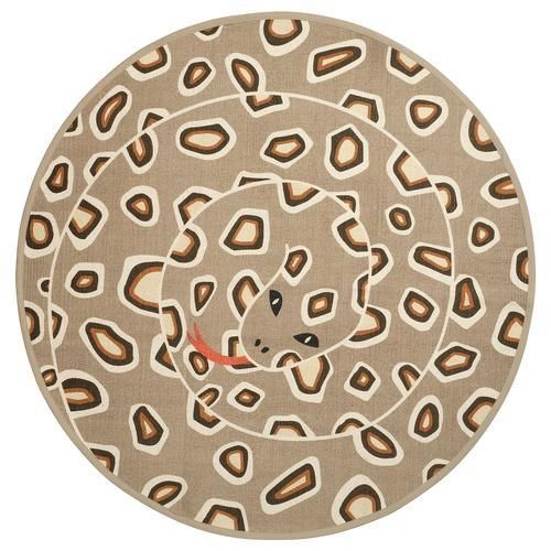 この円形の平織りラグは、美しい模様のヘビが丸まっているモチーフが特徴です。 SANDLOPARE サンドローパレ コレクションのほかのアイテムに描かれている草の中に同じヘビが隠れていないか探してみましょう。 裏面には滑り止め効果のあるコーティングが施されています