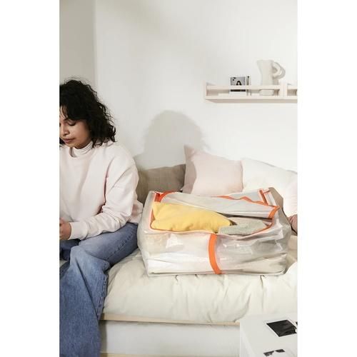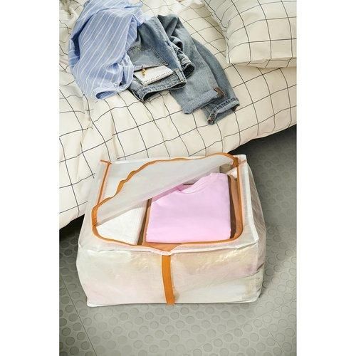 たっぷり入るこの収納ケースには、季節物の衣類や予備の掛け布団や枕を、また必要になるときまできちんと保管できます。 使わないときはコンパクトにたためます