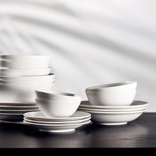 大きなサイズの中に小さなサイズを重ねて収納できるスマートなデザインのディナーウェア。場所をとらないので、さらに別なものを収納するスペースをつくれます